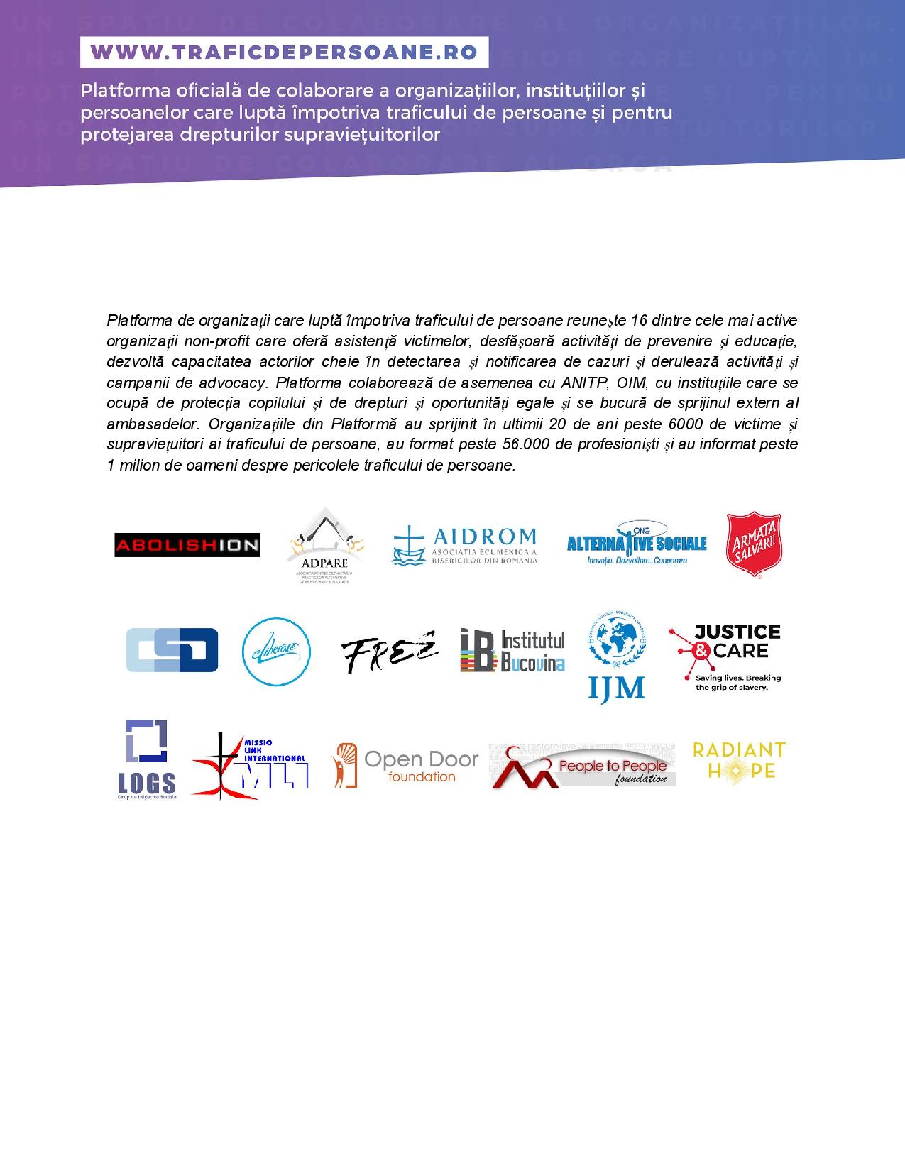 The People to People Foundation is a member of the Board of Directors of the Platform represented by colleagues with recognized expertise in working directly with the victims of this phenomenon. Together with our colleagues, we set out (in addition to the prevention and specialized assistance activities we have been carrying out for over 10 years) to be much more active and visible at the community level and especially in front of decision-makers, who, through the their politics, can bring significant improvements in the fight against trafficking!